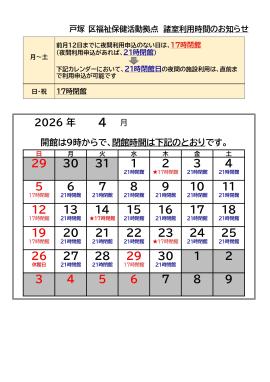 戸塚区福祉保健活動拠点 令和8年4月の閉館時間について 2026.03.17お知らせ 戸塚区福祉保健活動拠点の令和8年4月の閉館時間につきましては、上記のとおりとなります。 なお、見づらい場合は、下記のPDFをご参照ください。 4月閉館スケジュール